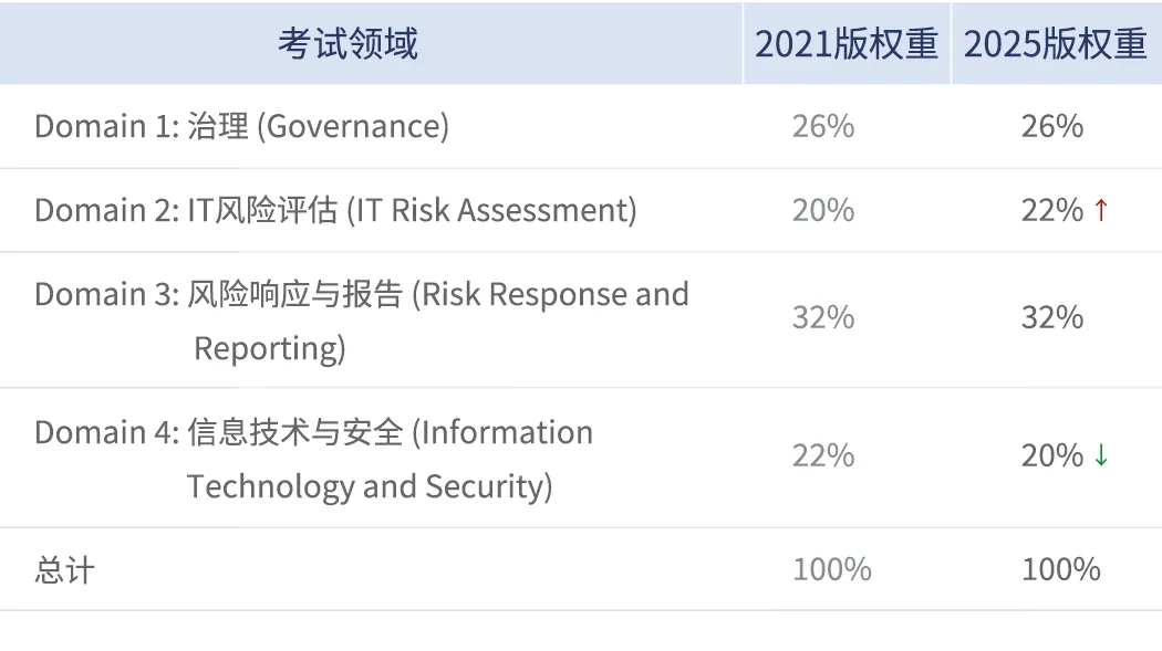 本次调整强化了“IT风险评估”在整体能力框架中的比重,体现了企业在数字化转型中对早期风险识别与量化分析能力的更高要求;同时适度优化了技术类内容的占比,突出风险管理的战略导向。